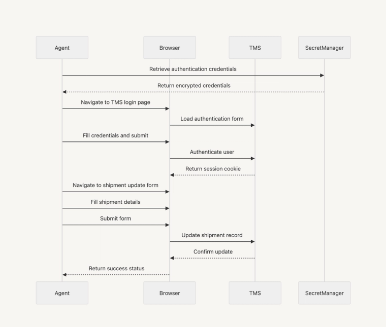 Consider what happens when an agent needs to update a shipment status in a legacy TMS. This isn't just a single API call – it's a complex, multi-step process: