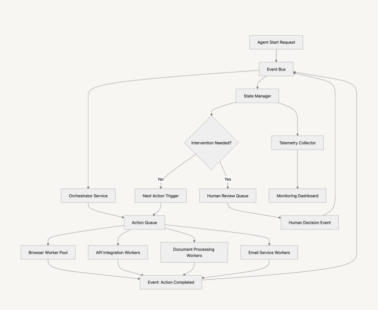 Behind the scenes, we've built CoPallet on an event-driven architecture that treats agent execution as a series of asynchronous operations. This design choice reflects the reality of logistics workflows – they're inherently distributed, often long-running, and need to coordinate across multiple systems with varying response times.