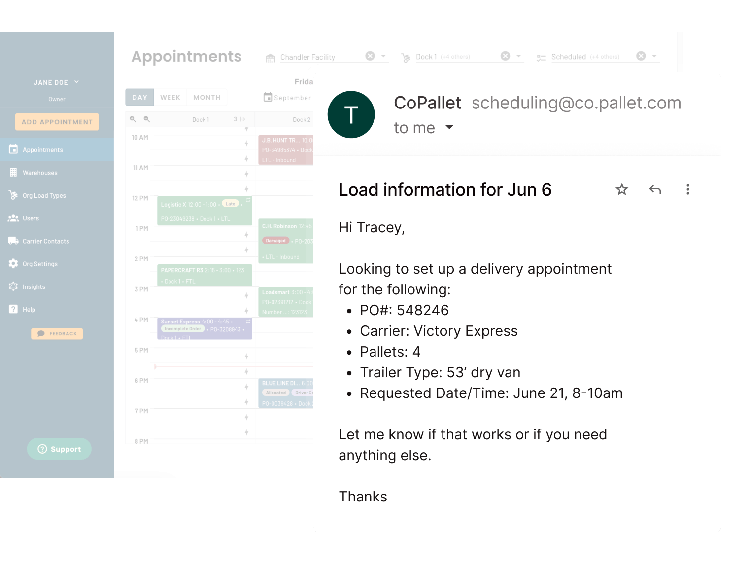 CoPallet works like how a seasoned coordinator would. It learns your SOPs, whether that means filling out unspecified pickup windows or following customer-specific rates.