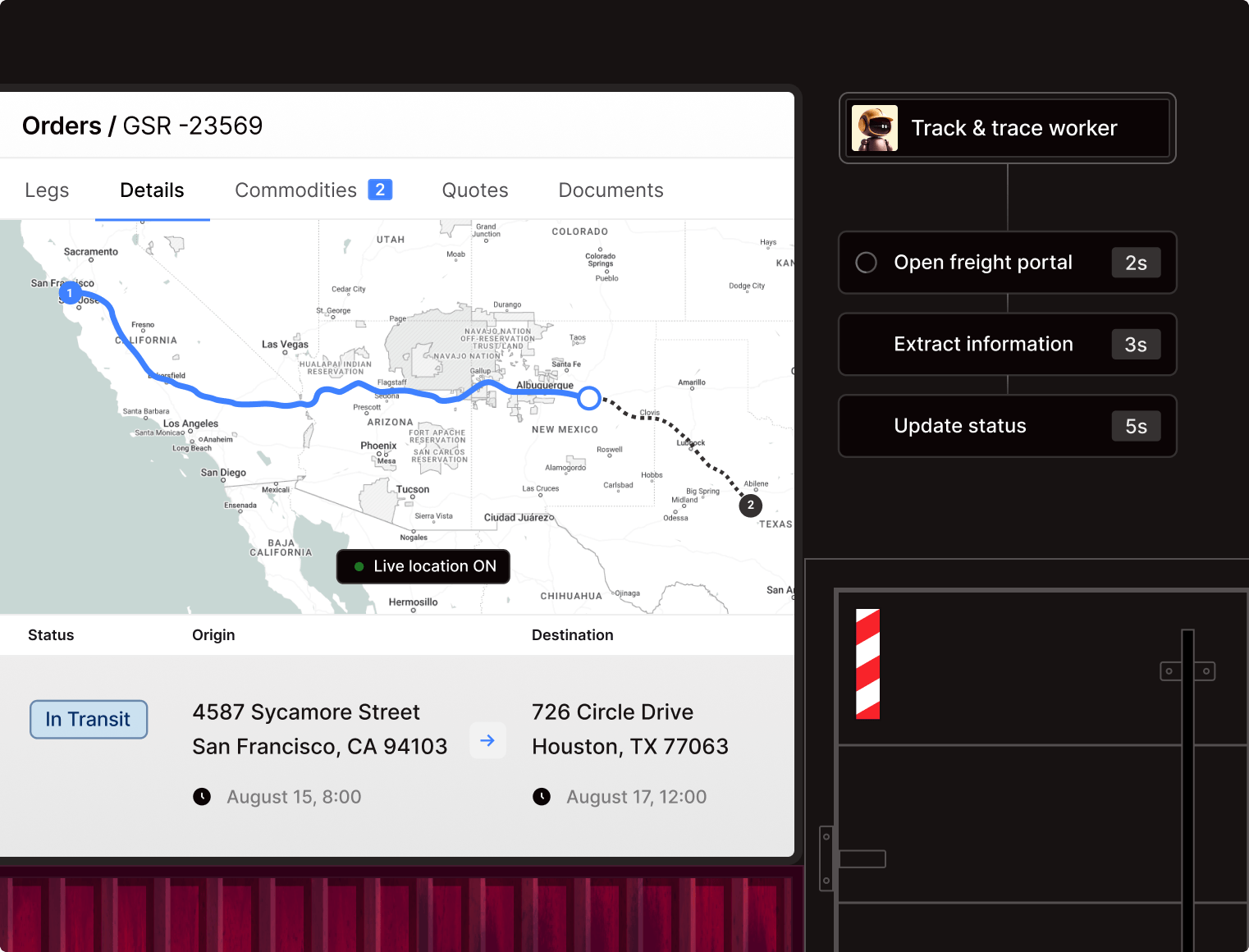 Human logistics experts stay in the loop to catch edge cases, monitor quality, and step in when needed. You get speed at scale with the oversight to trust every task gets done right.