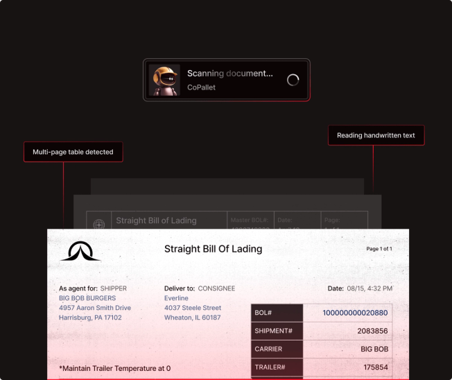 CoPallet processes document artifacts like different layouts, multipage tables, handwriting, and varying names (e.g. HAWB vs BOL number) with ease.