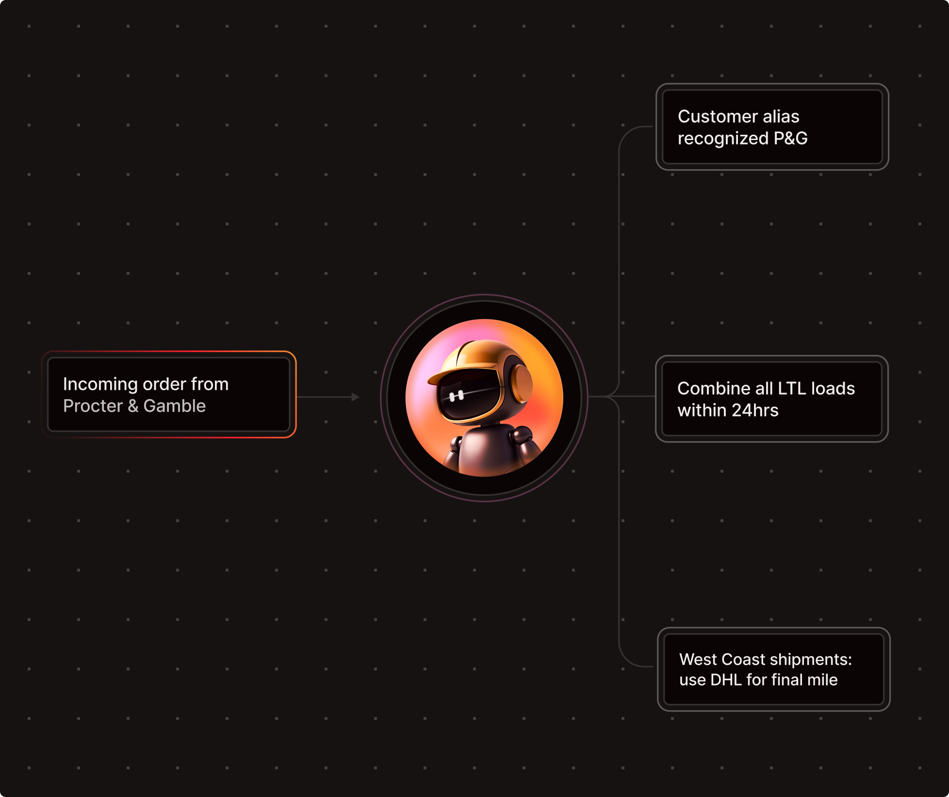 Apply thousands of customer-specific rules and tribal knowledge to make inferences. E.g. Procter & Gamble is coded as P&G, consolidate multiple LTL loads for ACME.
