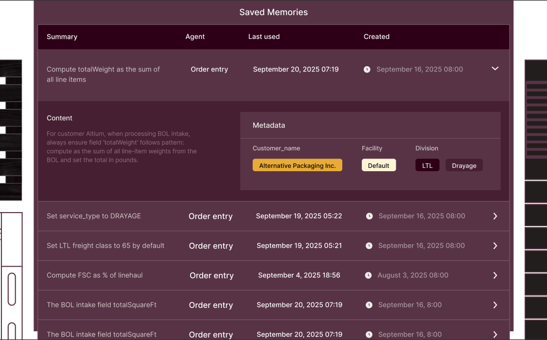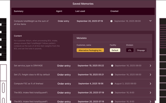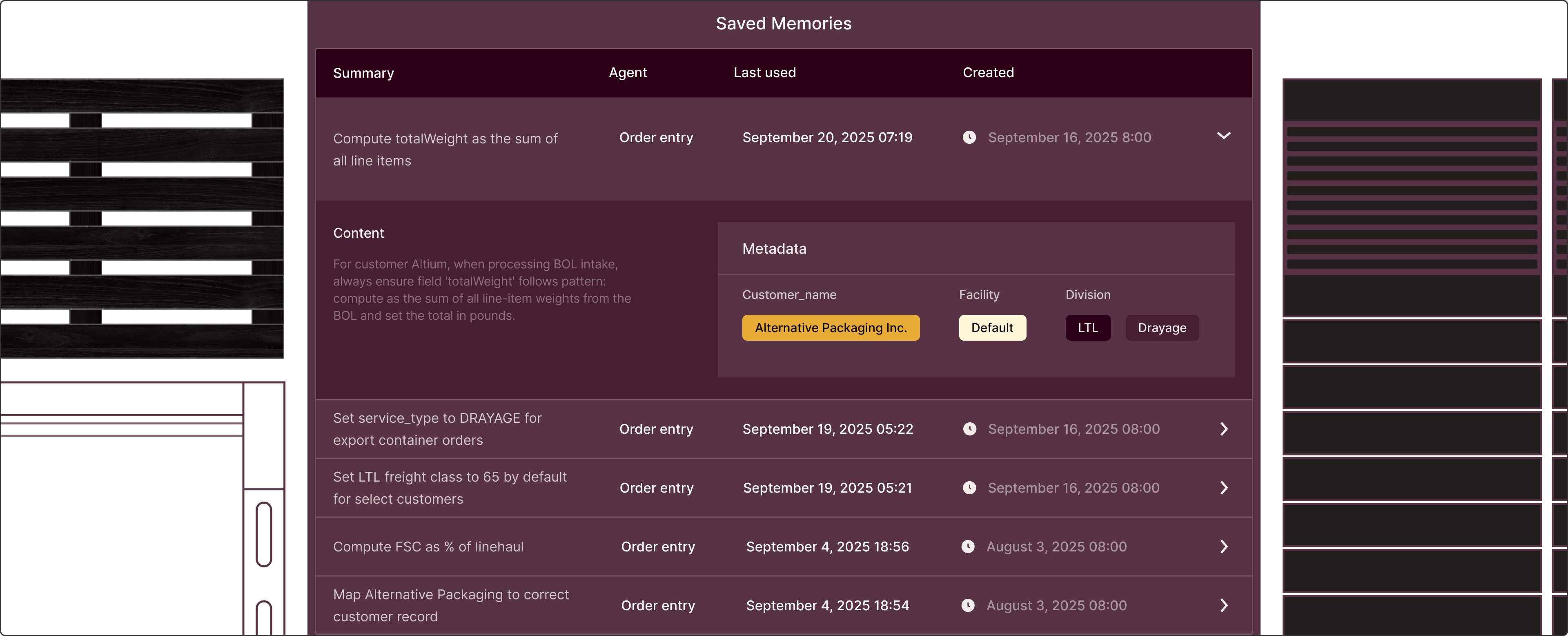 The CoPallet Memory Layer is built from your written SOPs, event logs, and history of manual interventions. Memories are automatically indexed and retrieved for relevant tasks.